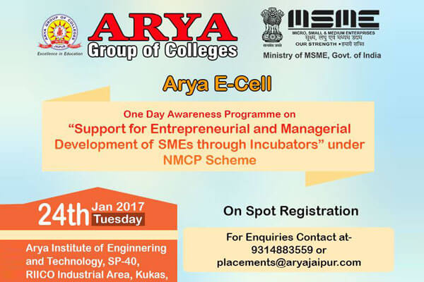 Arya College of Engineering & Research Centre is coming up with MSME sponsored workshop for young and budding